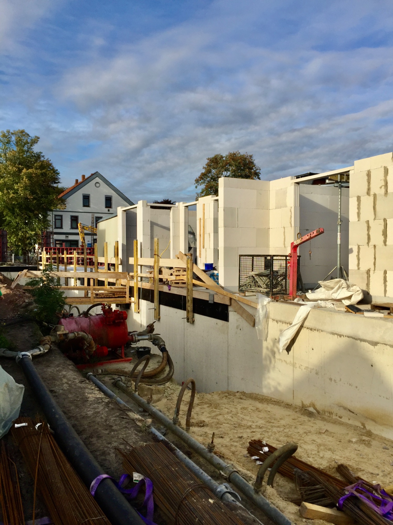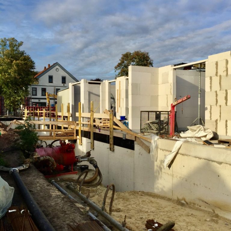 In diesem Bild aus der Bauphase ist im Hintergrund auch die umgebenden Bebauung zu sehen. An diese wurde der Neubau angepasst, u.a. durch graue Kantsteine an den Seiten der Gebäude.